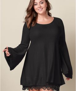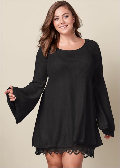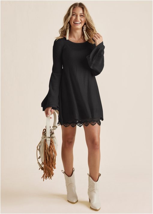 Show your boho side with a bit of sweetness in this mini sweater dress. The slip underneath gives coverage to the sheer. soft-to-the-touch fabric and finishes with a scalloped lace edge that peeks out from the hem. Wide bell sleeves add to the breezy look while the fitted scoop neck bodice adds contrast.