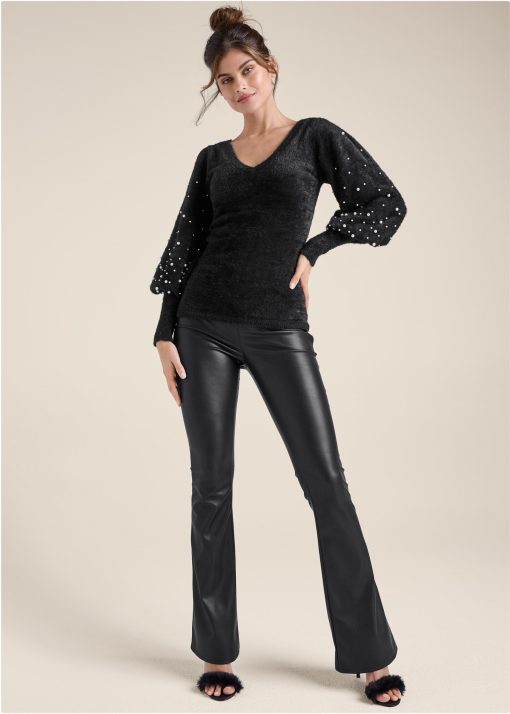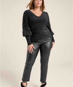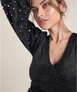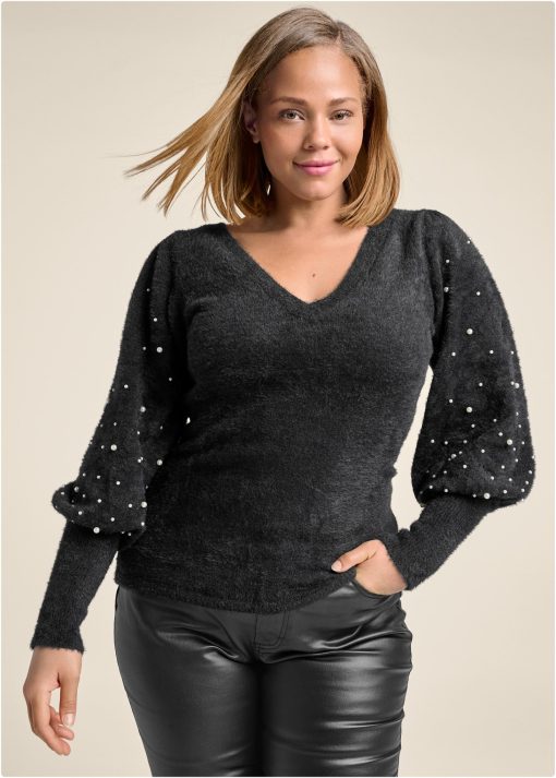 Cozy Bubble Sleeve Sweaters With Pearls – Black