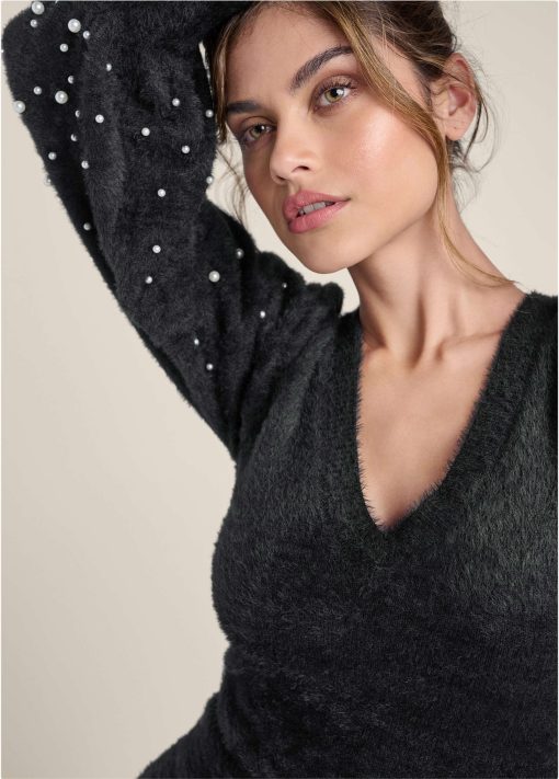 Bell sleeves. Pearl details on sleeves. V-neck. Eyelash yarn.