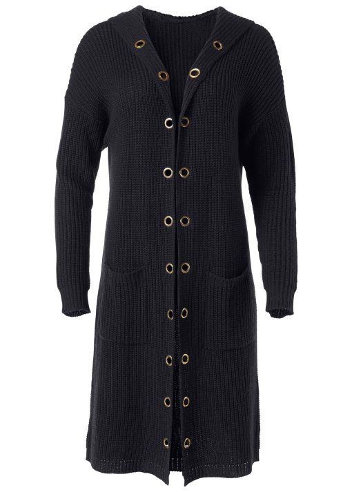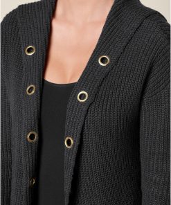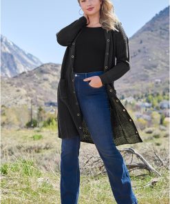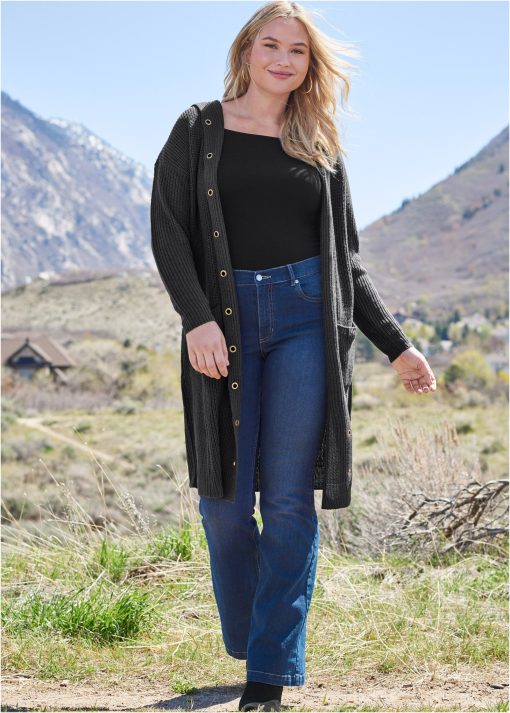 With its soft sweater material that looks as cozy as it feels. this knee-length duster moves with you as the seasons change! Grommets trim the open front. while a hood and slit pockets add cozy elements. Easy to layer over pants. leggings and skirts. it’s a classic that you’ll reach for time and again.* Sizes: XS (2). S (4-6). M (8-10). L (12-14). XL (16)* Plus sizes: 1X (18-20). 2X (22-24). 3X (26-28)* 37 approx. length; varies by size* Full long sleeves* Grommet detail at front* Functional front pockets* Acrylic. Imported