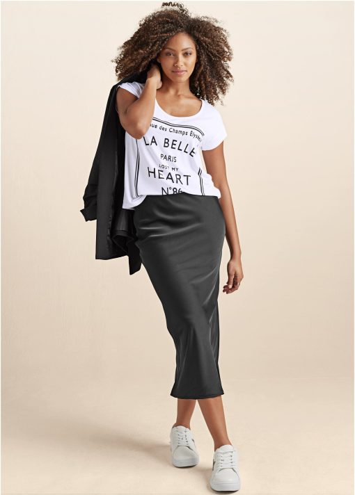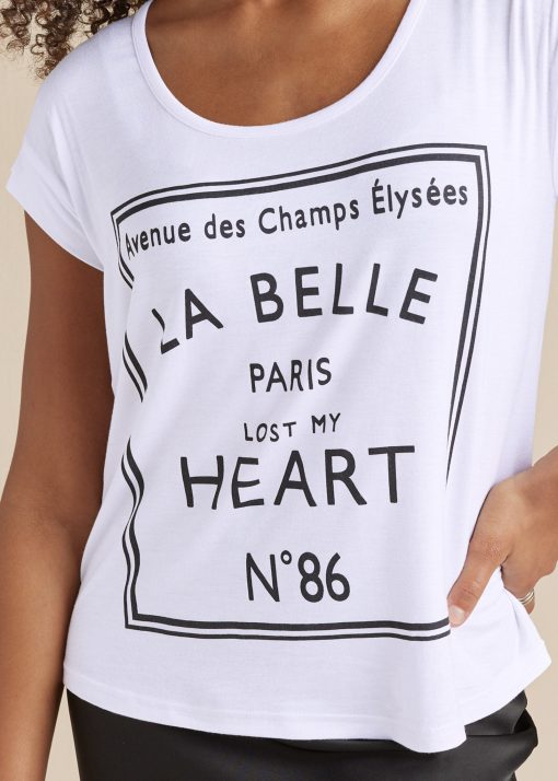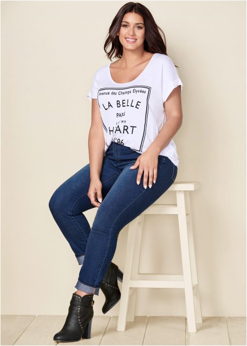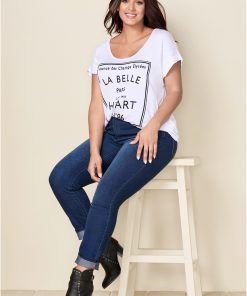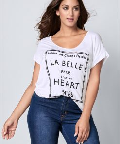 Je t’aime! You might just fall in love with this French-inspired tee that features a cheeky graphic that will capture your heart. The loose fit and wide scoop neck are flirty and perfectly Parisian. making this top a fun pick for casual days out. Pair with jeans or leggings for versatile style!* Sizes: XS (2). S (4-6). M (8-10). L (12-14). XL (16)* Plus sizes: 1X (18-20). 2X (22-24). 3X (26-28)* 25 approx. length; varies by size* Viscose/elastane. Imported