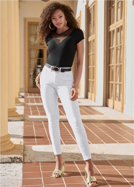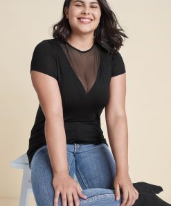 Our Mesh Detail Top blurs the line between V-neck and crew neck. featuring a sheer inset at the front that cranks up the sex appeal in this fitted. short sleeve piece. Worn loose or tucked in. this sleek pick is versatile enough for all seasons!* Sizes: XS (2). S (4-6). M (8-10). L (12-14). XL (16)* Plus sizes: 1X (18-20). 2X (22-24). 3X (26-28)* Mesh detail at front* 25 approx. length; varies by size* Viscose/elastane with poly mesh. Imported