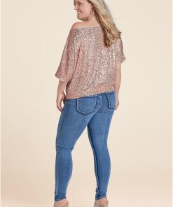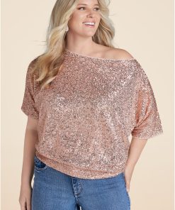 Sequins cover this slouchy yet sexy top. bringing glam allure to the banded. cropped fit. Off-shoulder styling provides a sultry peek of skin. while wide short sleeves get you set for a night out. With classic denim or daring faux-leather pants. this glitzy look is a stand-out no matter where it takes you.* Sizes: XS (2). S (4-6). M (8-10). L (12-14). XL (16)* Plus sizes: 1X (18-20). 2X (22-24). 3X (26-28)* Body is lined* Oversized fit* Banded bottom hemline* 20 approx. length; varies by size* Fabric has stretch* Poly/elastane. Imported