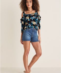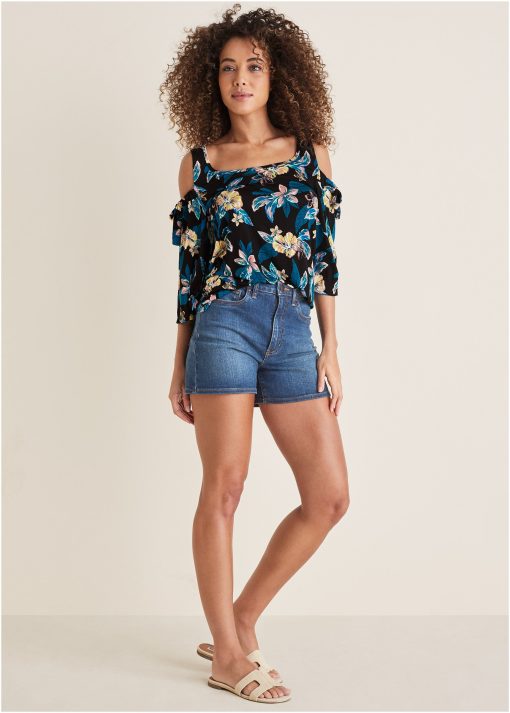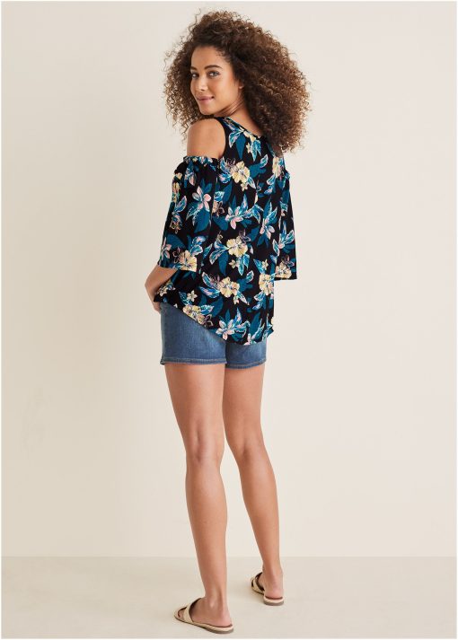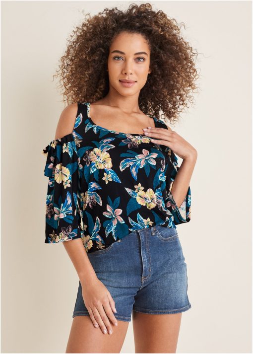 Printed Cold-Shoulder Top – Blue Multi