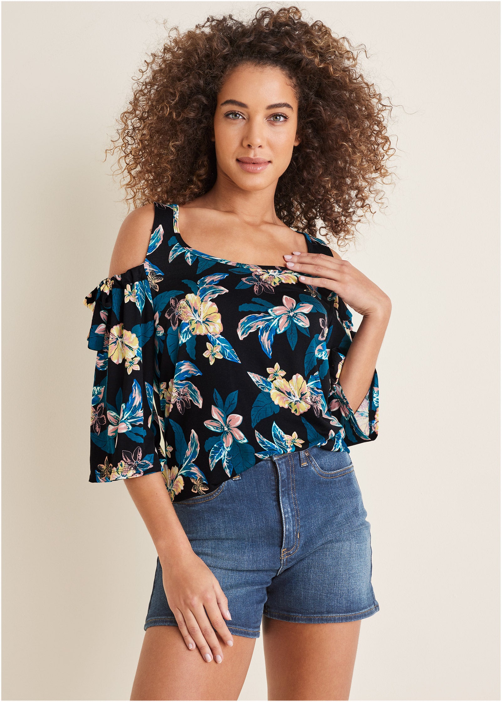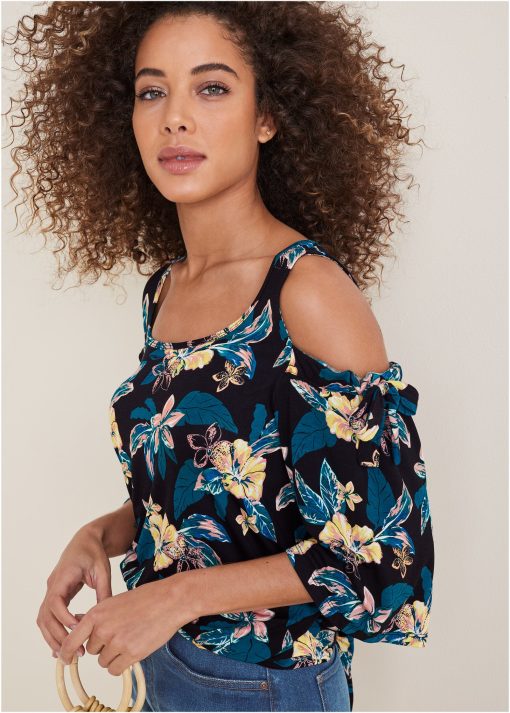 Bare shoulders with bow details assure instantly chic appeal! This 3/4 sleeve relaxed-fit top boasts an allover floral print. giving an extra-feminine touch to the effortless silhouette. Paired with jeans or shorts. this top will take you through the seasons.* Sizes: XS (2). S (4-6). M (8-10). L (12-14). XL (16) * Plus sizes: 1X (18-20). 2X (22-24). 3X (26-28) * Print placement may vary* Cold shoulders with bow details* Elastic at top of sleeve opening* Fabric has stretch* By Lascana for VENUS* Viscose/elastane. Imported