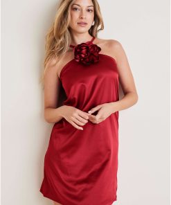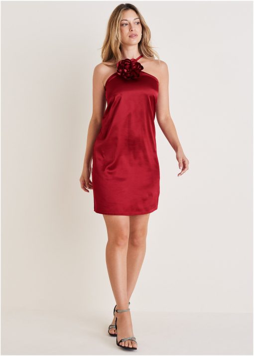 This stunning mini dress defines romance. With a standout rosette detail at the neck. this satin-style dress is a sight to behold. whether you’re dining at a renowned restaurant or hitting the dance floor. The best part about this stunner is it has the look of satin. but moves effortlessly and drapes beautifully.* Sizes: XS (2). S (4-6). M (8-10). L (12-14). XL (16)* Plus sizes: 1X (18-20). 2X (22-24). 3X (26-28)* Mini length. approx. 36.5 from shoulder strap* Adjustable spaghetti straps* Halter neckline* Flower detail on neckline* Polyester/spandex. Imported*Runs large. size down