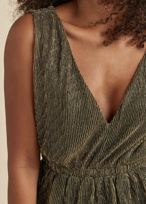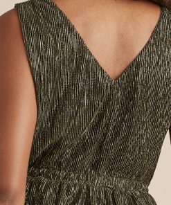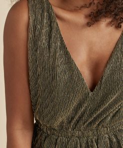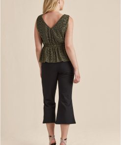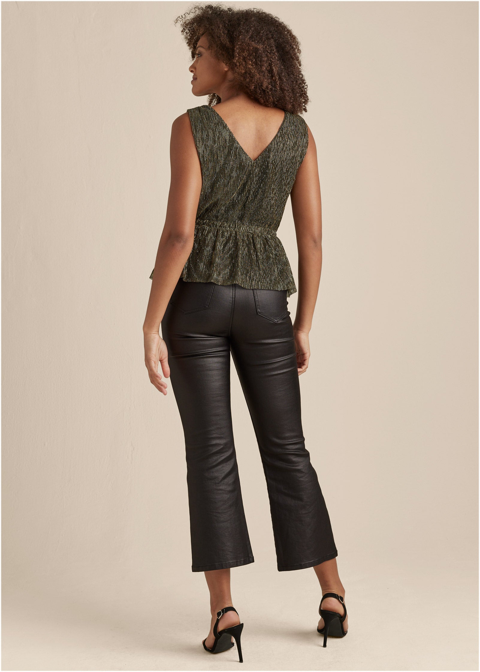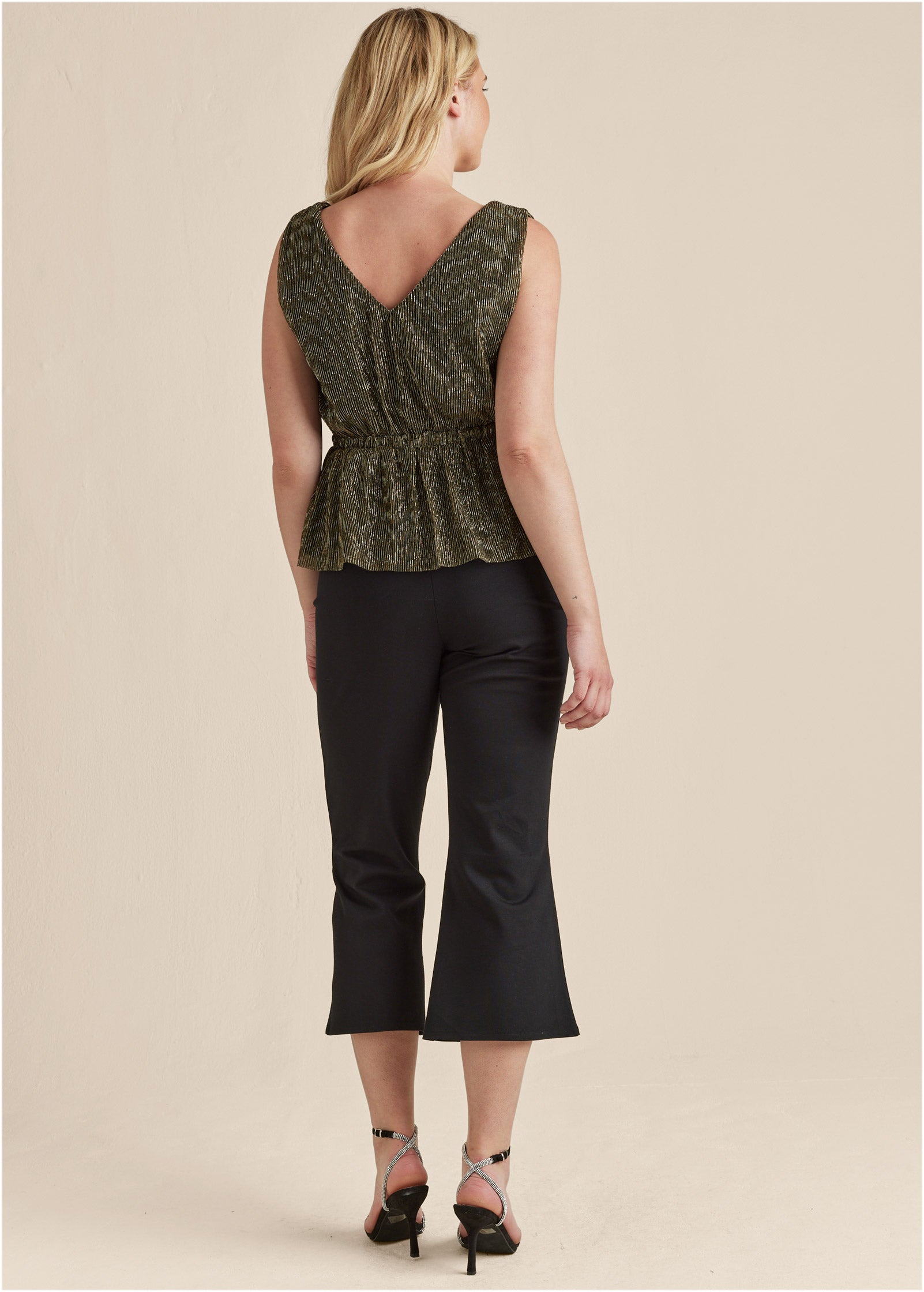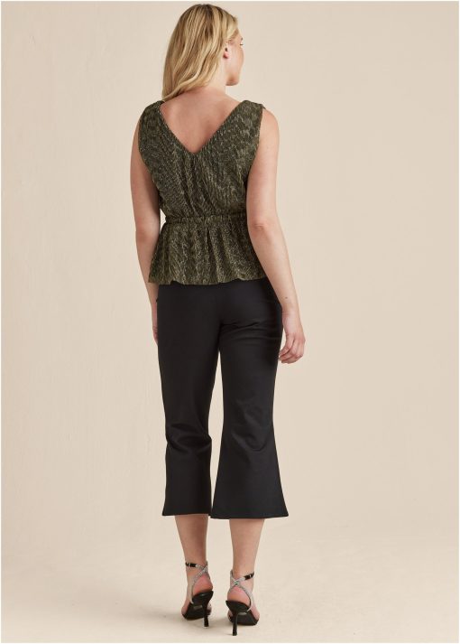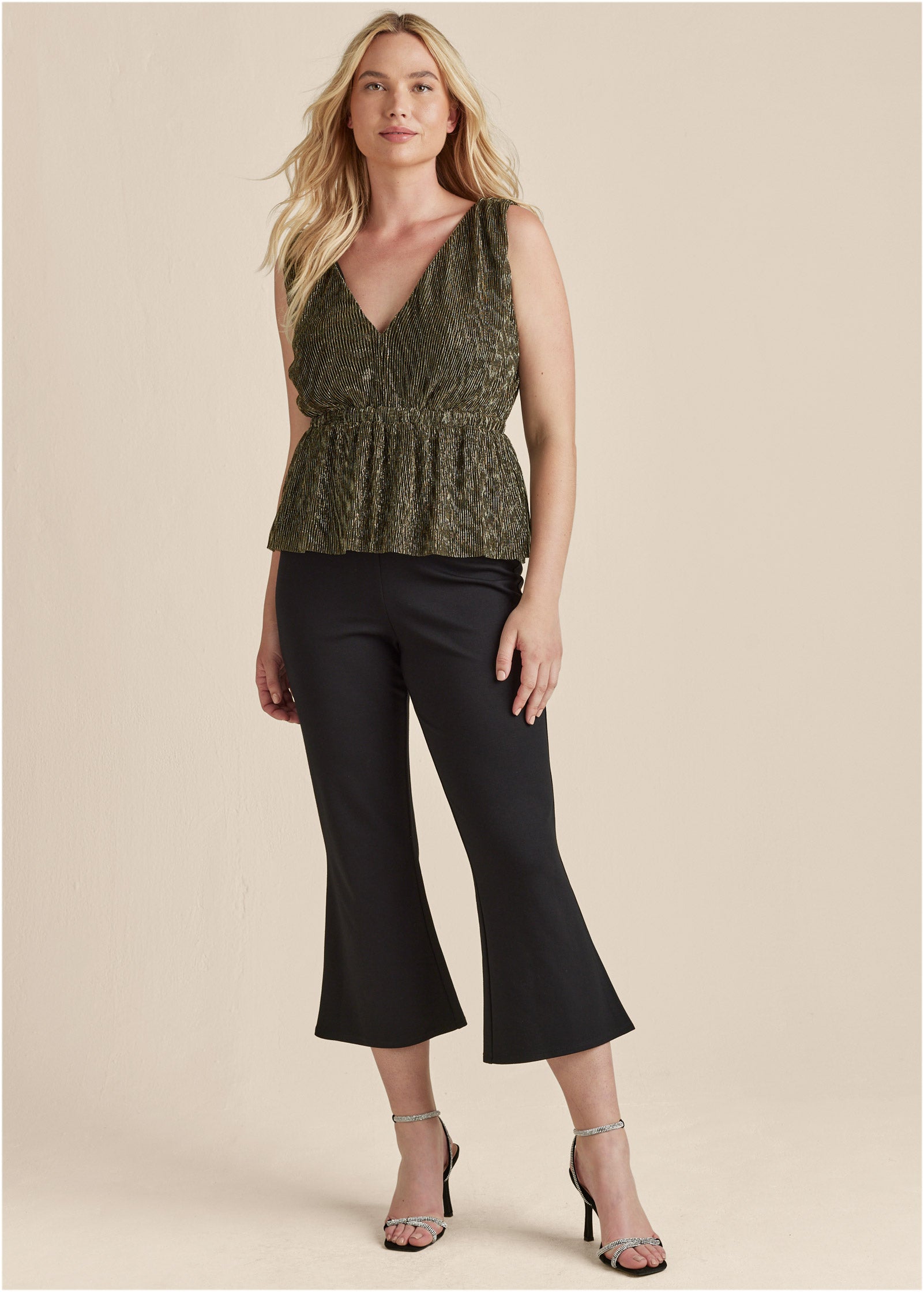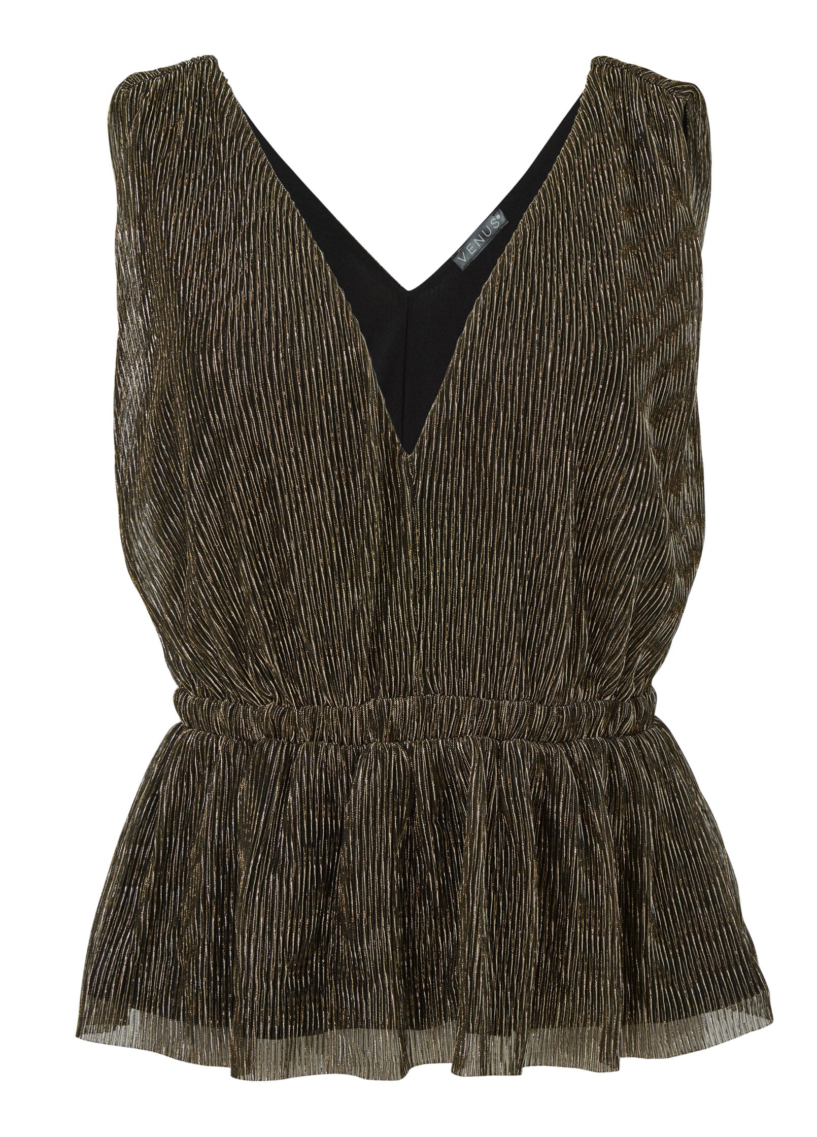 Shimmery metallic fabric is a party in itself. but textured plissé really takes things to the next level. On this V-front and V-back top with its cinched waist and flouncy hem. you’ll be turning heads wherever you go. We love this look as a fresh alternative to holiday sequins.* Sizes: S (4-6). M (8-10). L (12-14). XL (16)* Plus sizes: 1X (18-20). 2X (22-24). 3X (26-28)* 23 approx. length; varies by size* Sleeveless* V-neck and back* Elastic waist* Fully lined* Fabric has stretch * Poly. Imported