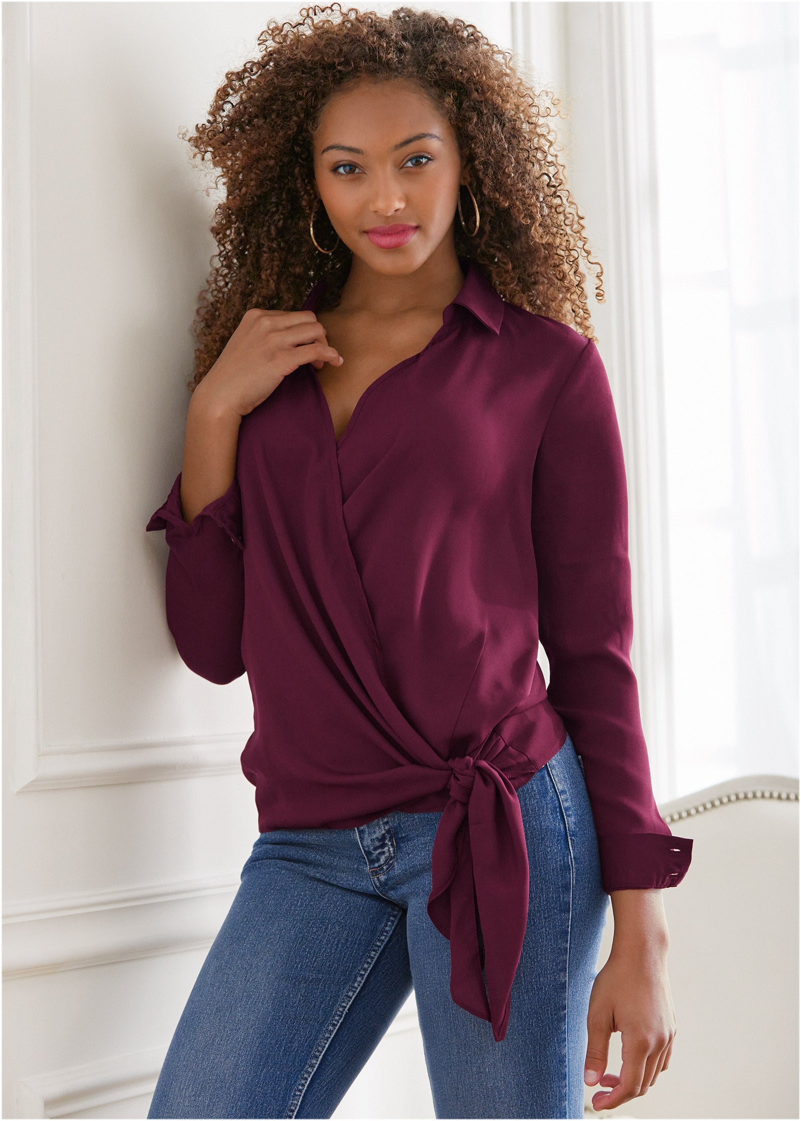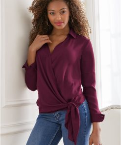 SKU: z66709-zird-surplice-side-tie-blouse-wine-28782590 Category: Shirts & Sweaters Tags: brand:VENUS, category:Clothing, color-code:ZIRD, color-description:Wine, color-family:RED, customer-rating:4 stars & up, fabric-class:Solids, fabric-type:Solids, final sale, inventory-VS21OF, limited variant availability, material-composition:100% polyester, occasions:Casual, out of stock, publication-list:A712|, size-chart:clothing, sleeve-length-type:Long, style-number:Z66709, style:Long Sleeve, type:Shirts & Sweaters